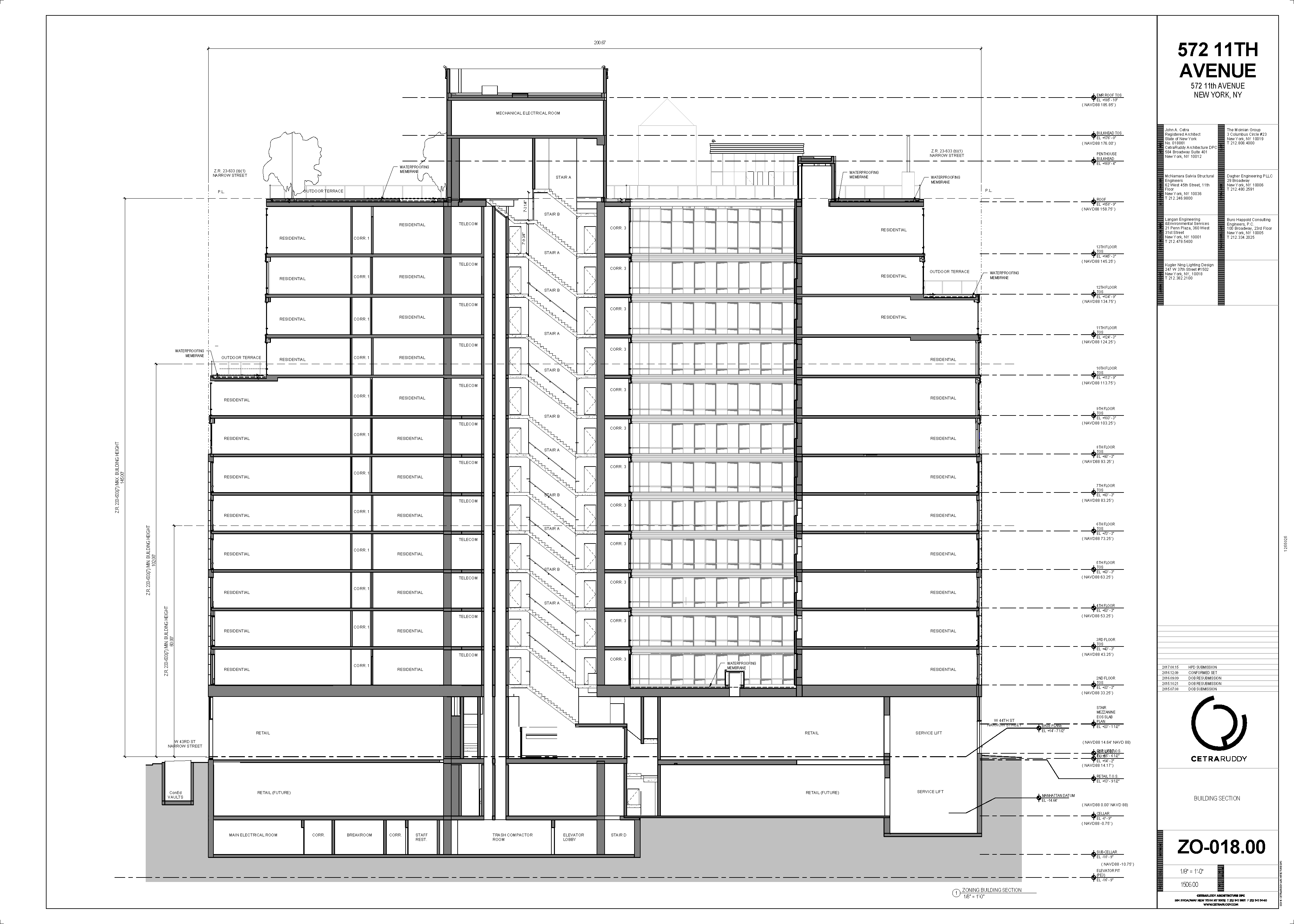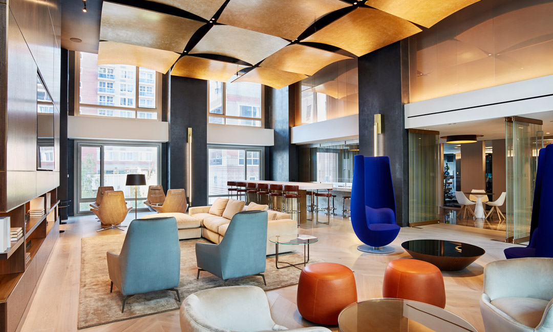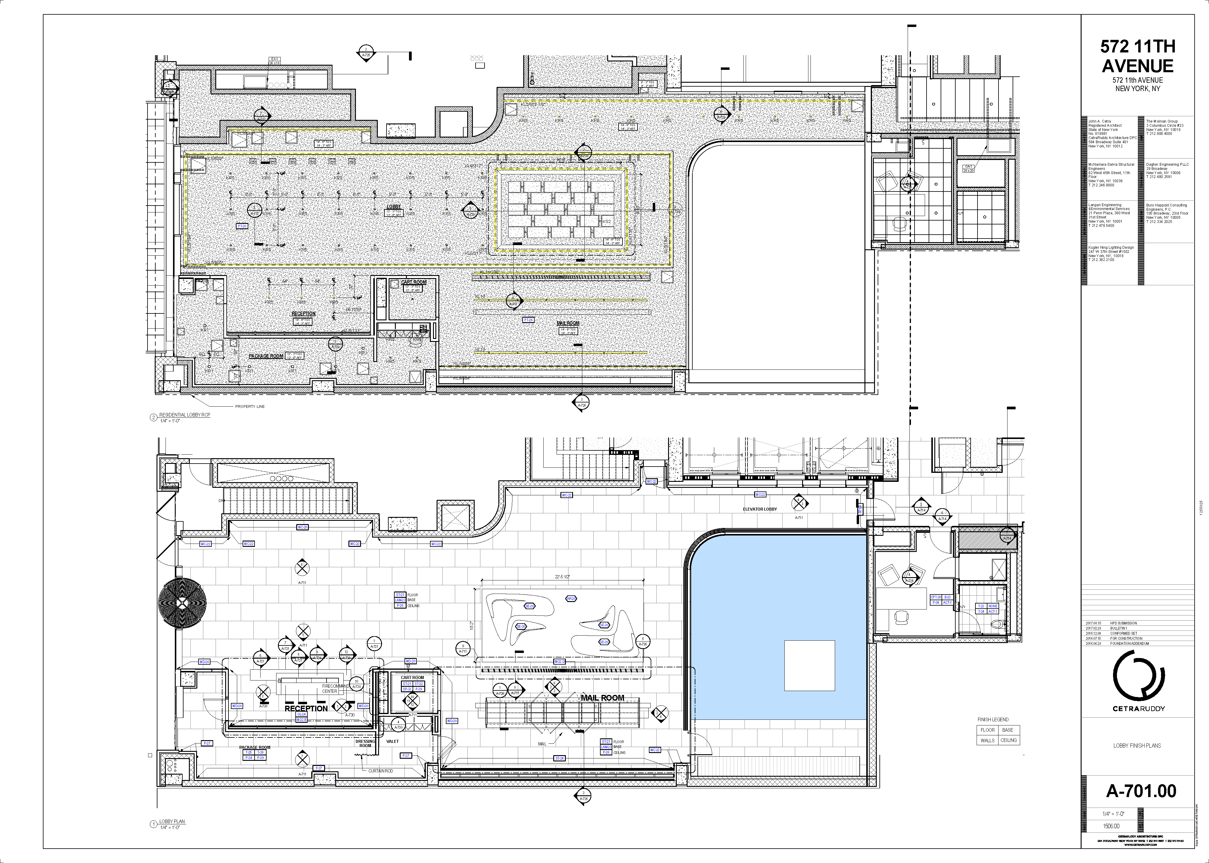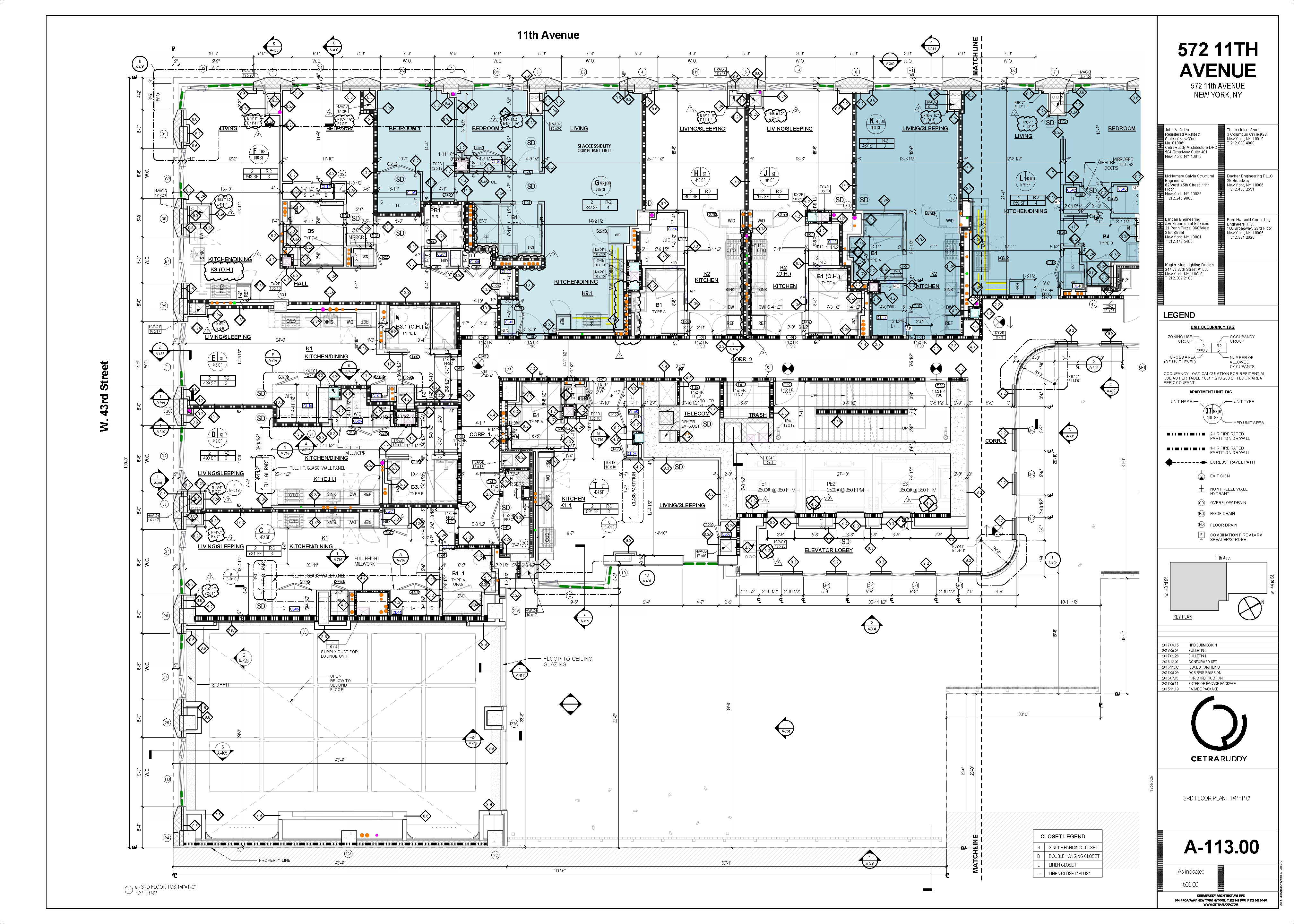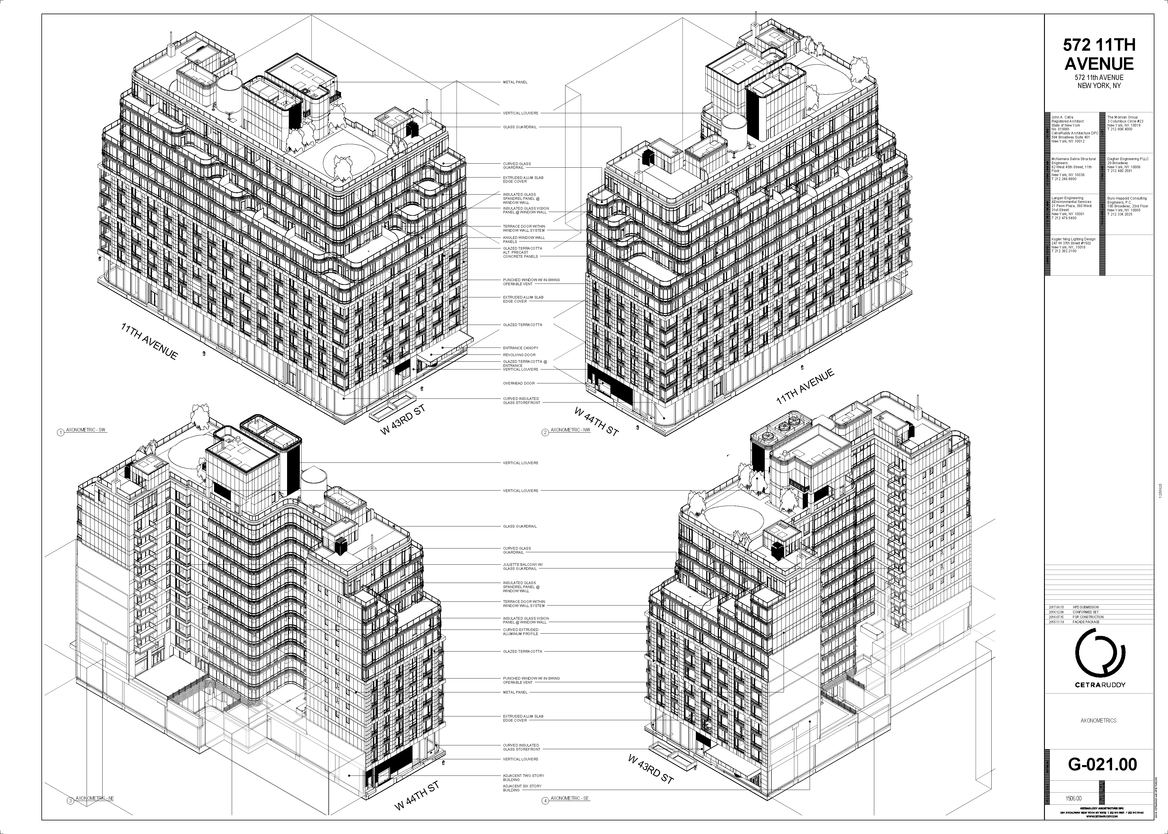 This was the first residential building I worked on, in NYC. It has an elegant character that is subtle and so well balanced. The glass ribbon at the base, initially a Tesla delivery center, floats the terra cotta block of punched openings above. The lower residential block clad in white has custom “bay” windows that kink out 10º to allow for more light and air. At the top, the ribbons of glass return to form terraces and panoramic views of the Hudson. I was responsible for detailing and coordinating the many custom ceilings, decorations, millwork and casework with independant fabricators. Many different sets were developed to gain approvals from the many agency in NYC. Below I have included a few samples from the HPD submission. This project spiked my interest in multi-family housing unlike anything I had worked on before. I became fascinated with the level of detail and coordination.